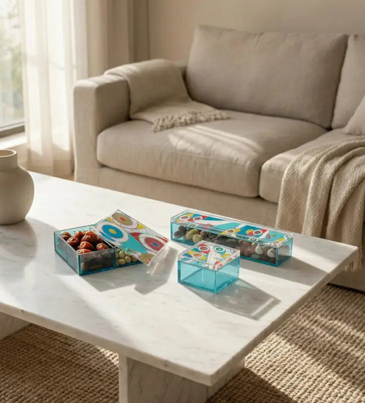 This colorful acrylic box from Kashida’s Supernatural collection reimagines the evil eye, a timeless Middle Eastern symbol of protection and good fortune, through bold, modern geometry. The vibrant design radiates positivity and balance, making it a striking piece for storing accessories, sweets, or keepsakes while infusing your space with meaning and energy.